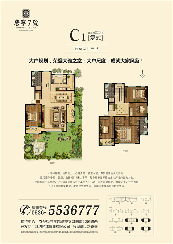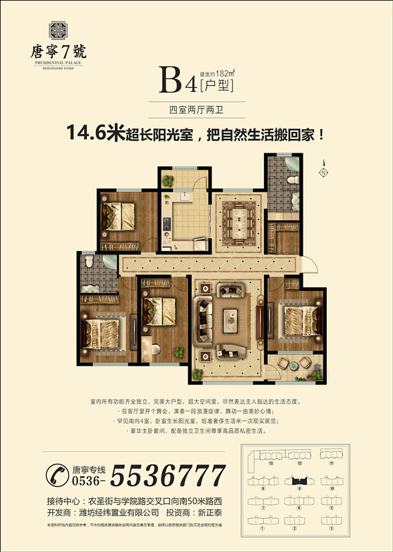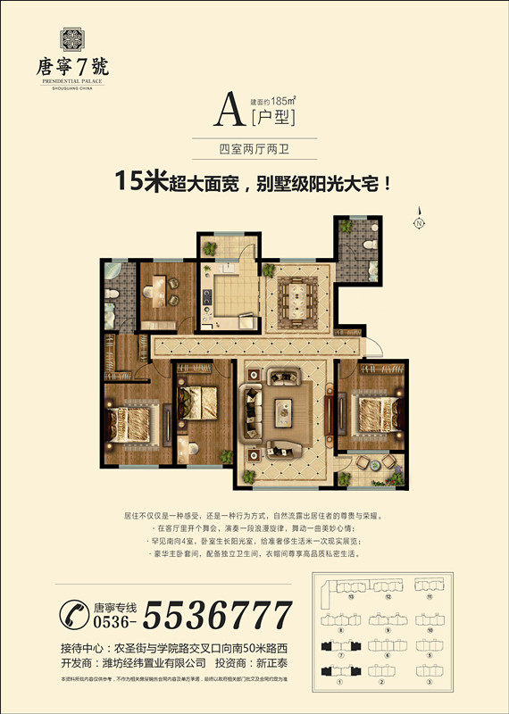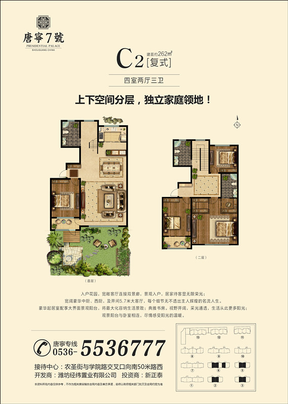 我們的戶型有105——190㎡景區洋房,210-360㎡的復式疊拼。我們項目以“ 健康、環保、人文居住 ”為主題,項目無論是產品定位,還是在規劃設計方面,都將打造成**的居住環境,產品采用通風采光效果較好的板式建筑,每一個戶型都是采取設計師的精雕細琢。所有產品均是在采取客戶的建議和意見開發基礎上,結合壽光本地居住習慣設計而成,所有房源均南北通透,方正實用,保證居住舒適性。