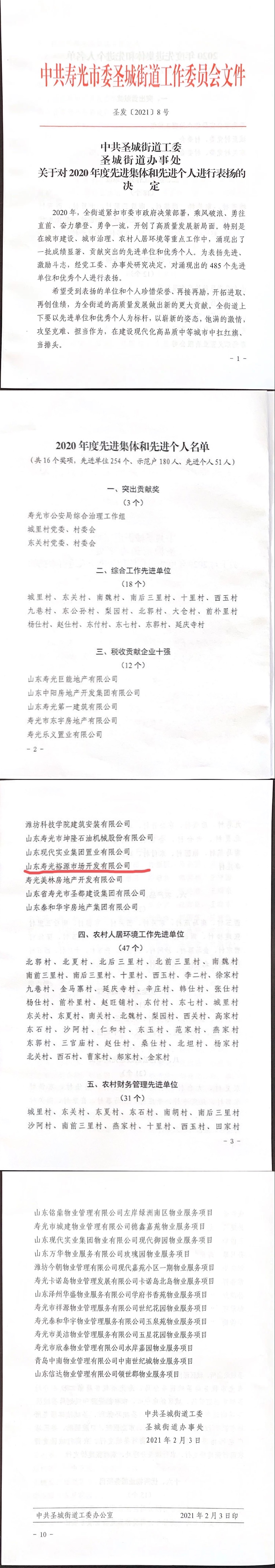 2021年3月,新正泰控股公司山東壽光裕源市場開發有限公司被中共壽光市圣城街道工作委員會授予“稅收貢獻企業十強”榮譽稱號。